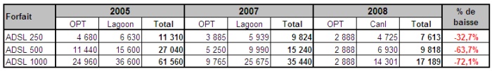 Avant la mise en service du câble sous-marin nous reliant à l’Australie (courant 2008) le tarif OPT était variable selon le forfait choisi. Voici donc l’évolution des tarifs ADSL entre 2005 et 2008 (les offres 2008 sont celles proposées lors de la mise en service du câble sous-marin).