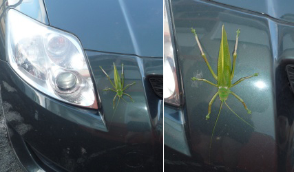 En fait hier matin nous décidons de déposer la voiture à Speedy pour une vidange qu’elle nous réclamait à corps et à cris depuis quelques temps ; au moment d’embarquer on remarque qu’une sauterelle de cocotier squatte paisiblement à côté d’un phare. Plutôt que de la dégommer d’un coup de claquette on suppose qu’elle sera éjectée quand on roulera… Que nenni, la bestiole s’offrira même le luxe d’une balade sur le capot pendant le trajet ; arrivés au garage elle est toujours là !