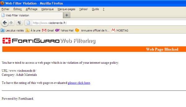 Comme tous les matins en arrivant au taf je décide d’aller jeter un oeil aux dernières news du site Vie De Merde (oui je sais que c’est pas bien mais là n’est pas mon propos, arrêtez de me couper bon sang de bonsoir) et là j’ai la surprise de voir un message d’alerte de Fortiguard (la solution de filtrage web utilisée par la CAFAT). Bon que la chose bloque un site n’ayant aucun rapport avec mon taf j’me dis que ma foi somme toute ça reste assez logique mais le plus comique reste le motif du blocage : Contenu pour adultes ! Et voilà VDM référencé comme un site porno… Ah bin merde alors, j’sens que j’vais leur l’envoyer celle-là en VDM justement…