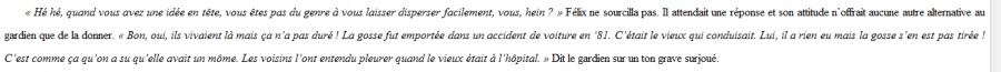 – J’ai plus été « dérangé » par les erreurs typographiques : espaces oubliés avant les signes de ponctuation composés (? ; : !) ou entre les guillemets (non typographiques soit dit en passant) ; mais là encore ça agace plus ma maniaquerie que la lecture à proprement parler. Je persiste à dire que pour pour un premier roman, auto-édité qui plus est, le résultat est plus qu’honorable.