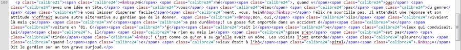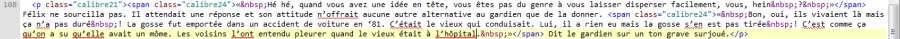 – Un fichier de sortie epub alourdit par de nombreuses balises <span> inutiles (cf exemple ci-dessous). le fichier « original » faisait 605 Ko, la version light en fait 288.