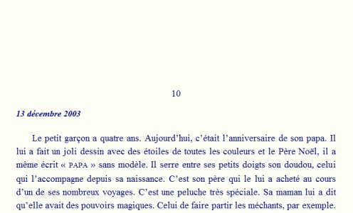 Certains chapitres renvoient à des flashbacks, l’apparence de la première page est alors du genre : le n° de chapitre, la date de l’action et enfin le texte. Je suppose en tout cas que c’est comme ça qu’ils se présentent dans la version papier du roman.