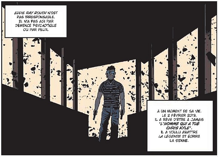 Si vous avez vu American Sniper, je ne peux que vous recommander de lire ce roman graphique qui vous propose d’aborder l’histoire via une approche différente et surtout de découvrir les suites du crime (le film s’arrête avant le procès d’Eddie Ray Routh).