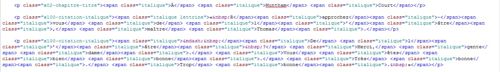 J’ai par contre été vachement surpris par la lourdeur de certains codes, notamment dans les pages consacrées au prochain roman d’Ehtelred ; là encore ça ne change strictement en terme de lisibilité du bouquin, mais quand je vois un code pareil ça me colle des frissons… donc je corrige (toujours via Sigil).