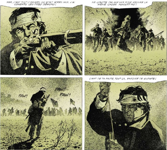 Si les scènes de combat sont bel et bien présente au fil des pages, l’auteur priorise l’impact de la guerre sur la psyché de l’humain. Son personnage n’a rien d’un héros invincible, c’est une jeune recrue lambda qui va se retrouver confrontée à une situation qui dépasse l’entendement… et forcément face à l’horreur et à l’incompréhension ça cogite dur dans sa tête.