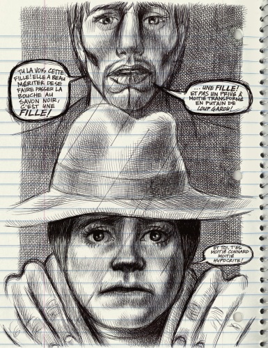 Au niveau du graphisme Steve Cuzor opte pour des planches en bichromie noircies à l’encre de chine et joue énormément avec les ombres. Contre toute attente (je craignais des planches trop sombres), le rendu est des plus convaincants, que ce soit dans les décors ou les expressions des personnages, le résultat est criant de vérité.